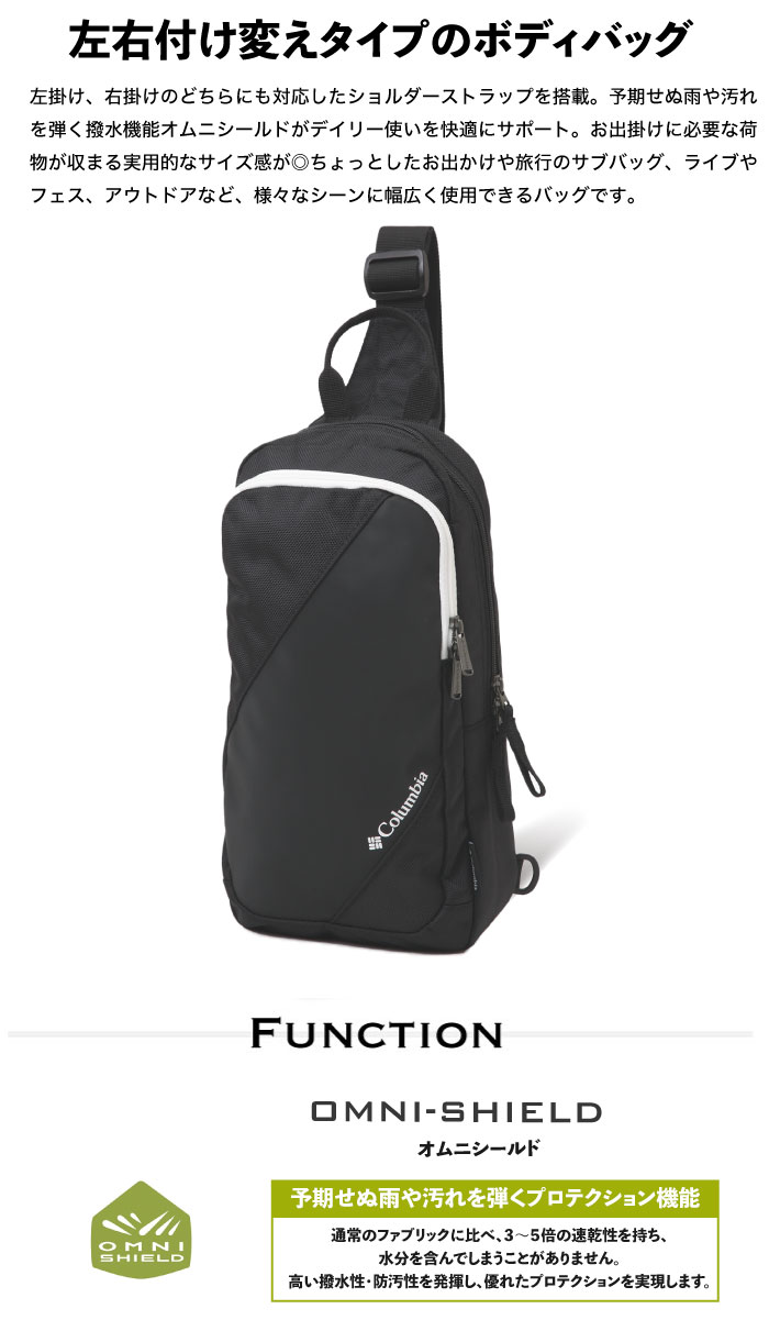 | 【コメント】 アクティブにもカジュアルにも使えるボディバッグ! 財布やスマホ、ポーチ、手帳など、普段良く使うアイテムの収納にぴったりのサイジング。 ショルダーベルトは左右付け替え可能で、スタイルに合わせて左右の肩掛けを変えるのも◎ 予期せぬ雨や汚れを弾く撥水機能オムニシールドがデイリー使いを快適にサポート。 ちょっとしたお出かけや旅行のサブバッグ、ライブやフェス、アウトドア、子供用としてもおすすめ! | |||||||||||||||||