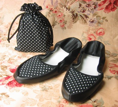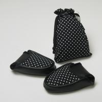 携帯スリッパPTA、保護者会、面接に、真面目でおしゃれな雰囲気の携帯スリッパです。イメージアップにしっかり貢献するデザインです。スリッパは二つ折りにして巾着に入れます。サイズ:Lサイズ;23.5から24cm対応 Mサイズ;22cmから23cmに対応 Mは小さめのサイズでございますので、23.5cm以上の方はLサイズをお求め下さい。履き口にゴムが入っていますので脱げにくいです。甲の部分水玉プリント生地、側面底面は黒の合皮。