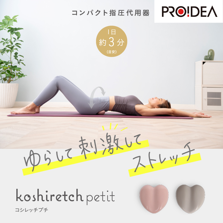 ゆらゆら揺れるだけ!仙骨まわりをゆらして刺激してストレッチ!仙骨(せんこつ)に当てて、寝ころんでゆらゆらするだけのコンパクトな指圧代用器として人気のコシレッチ。そのコシレッチがさらに小さく、手のひらサイズになって登場!仙骨にぴったりフィットして、ピンポイントでアプローチできます。気になる腰まわりをストレッチしたい。そんなときに「コシレッチpetit」が大活躍。腰まわりが気になるときは、ゆらして刺激してコシレッチしましょう!小さいからこそ、ピンポイントにもっと刺激したい方におすすめです。腰以外にも足裏・肩甲骨などいろいろな部位に使えます。手のひらサイズだから、バッグにポンッ!と入る可愛らしさで持ち運びにぴったり。自宅ではもちろん、仕事先やおでかけ先にも。家に馴染みやすい柔らかなニュアンスカラーで置いておくだけでもおしゃれな色合い。(1)おしりの真ん中に当てて、約30秒左右に軽くゆれるだけ!(2)2つの突起が仙骨まわりの筋肉をゆらしてぐいっと刺激!小さいけど専門家が開発した実力派!(3)手のひらサイズの持ち運びしやすいサイズ!いつでもどこでも仙骨にフィットさせて気になる腰回りに!