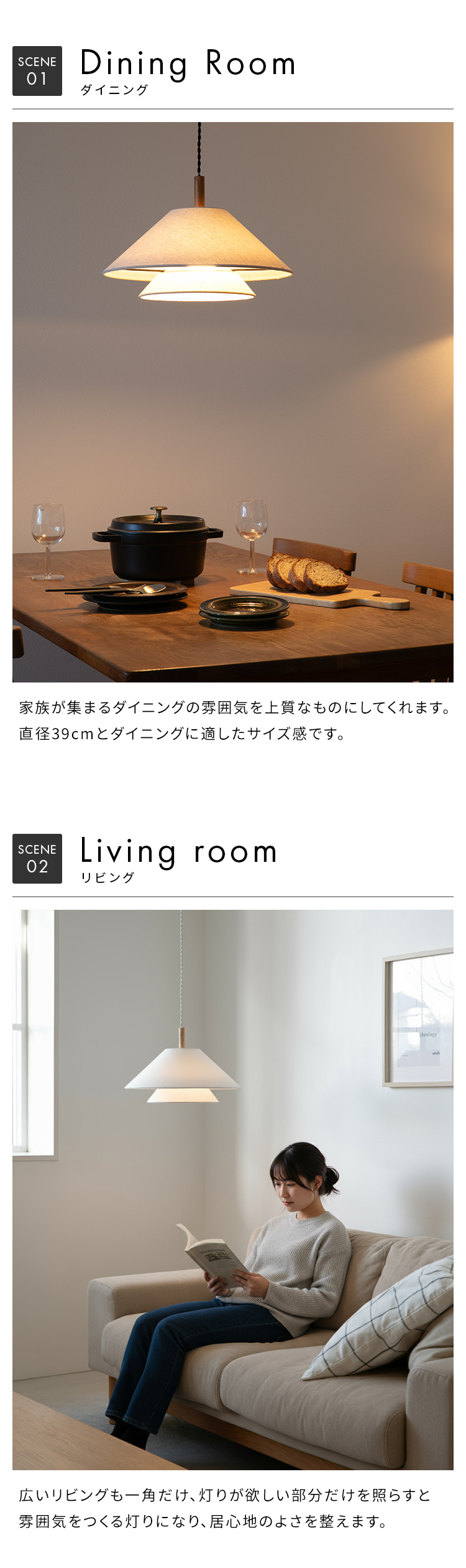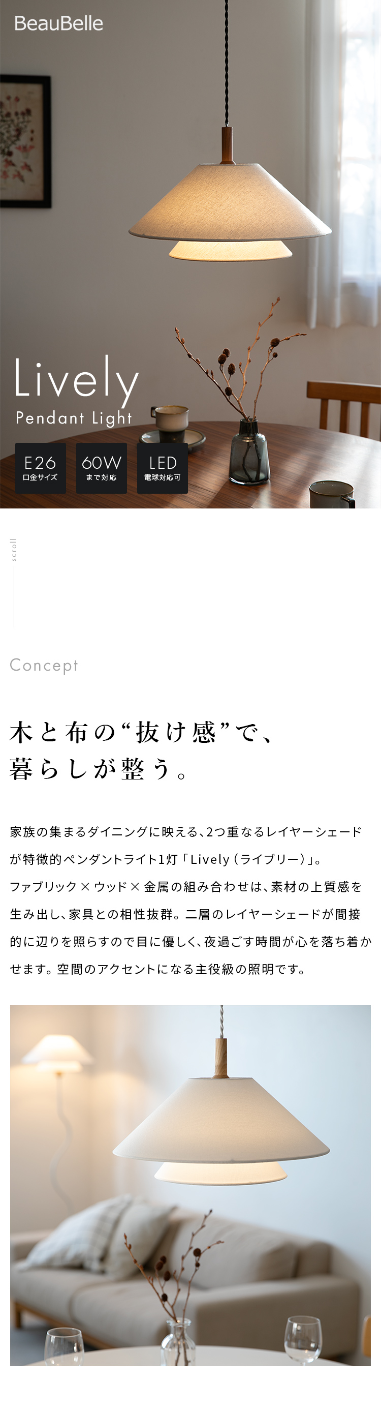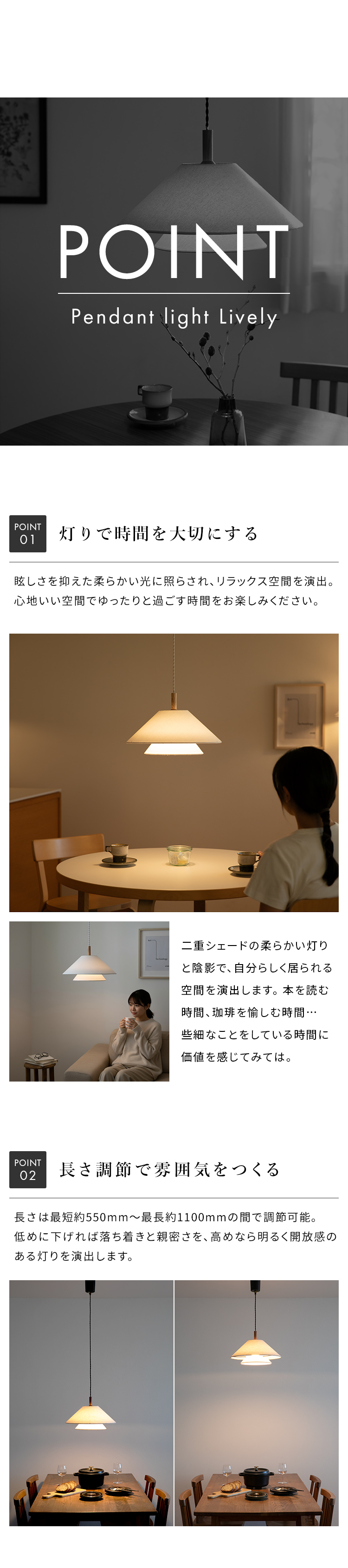 家族の集まるダイニングに映える、2つ重なるレイヤーシェードが特徴的なペンダントライト1灯「Lively(ライブリー)」。