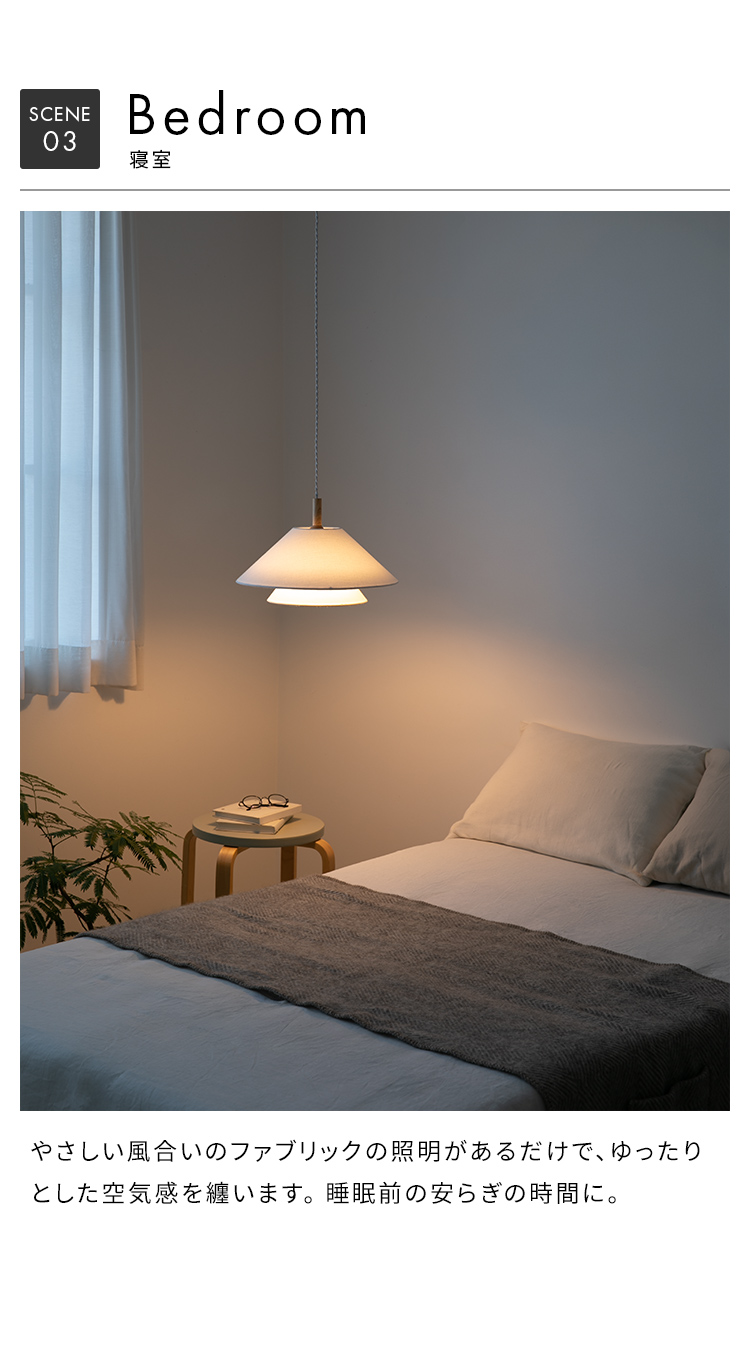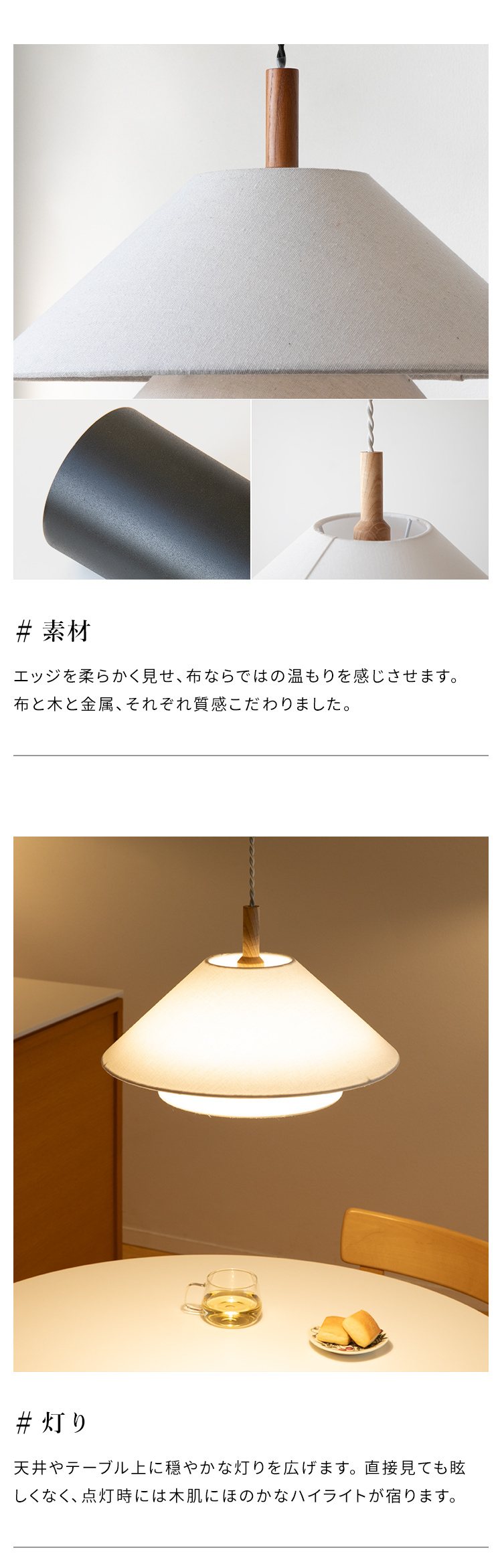 ファブリック×ウッド×金属の組み合わせが空間のアクセントになる主役級の照明です。