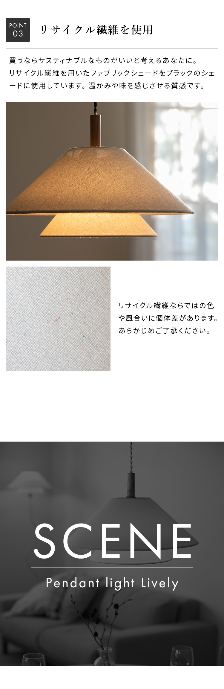 本商品のファブリックシェードはリサイクル繊維を使用しており、その特性上、色味や風合いに個体差が生じる場合があります。