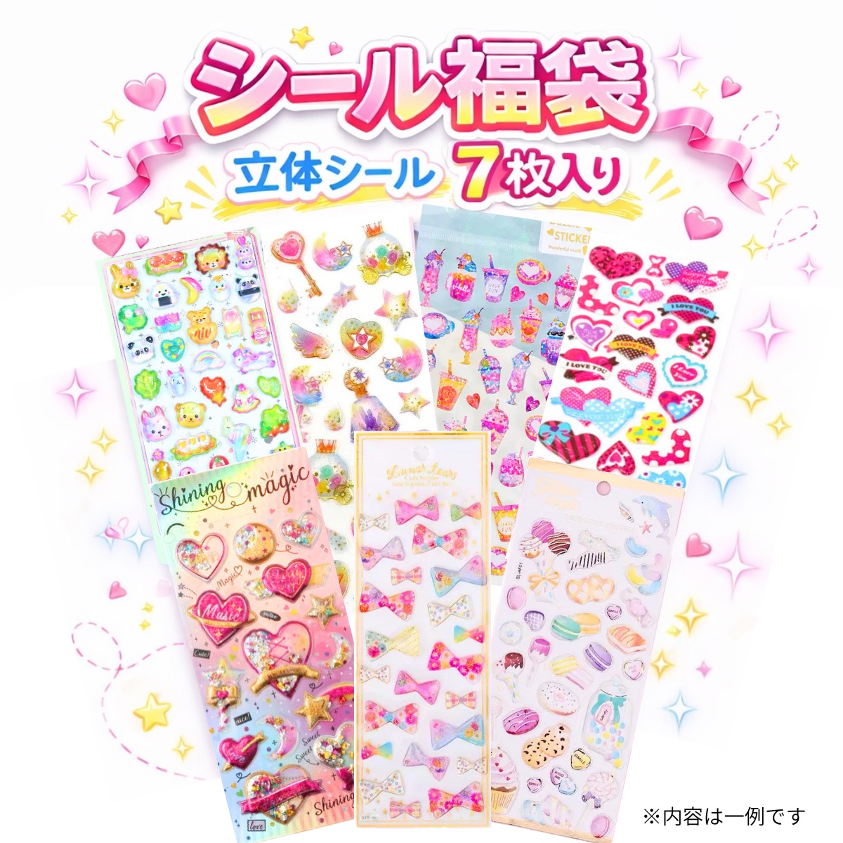 福袋 ぷくぷくシール 7枚セット 立体シール 3D ゆめかわ 可愛い 透明 パステル 文房具 キッズ 子供 ごほうび ハート キラキラ コラージュ おしゃれ 手帳
