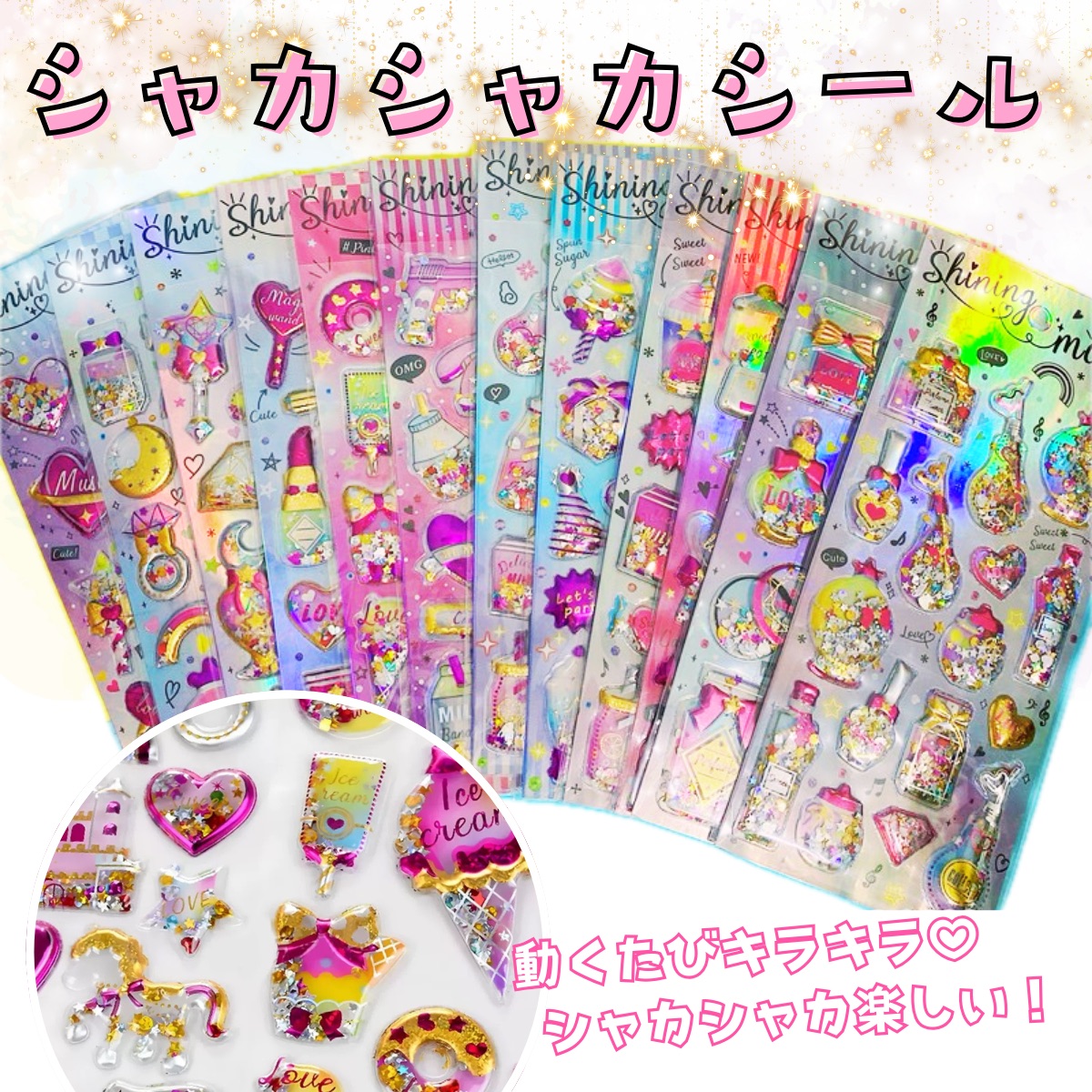 全12種 シャカシャカシール 立体 3D 可愛い 透明 パステル デコレーション キッズ キッズ 子供 ごほうびシール ハート 海外雑貨 おしゃれ