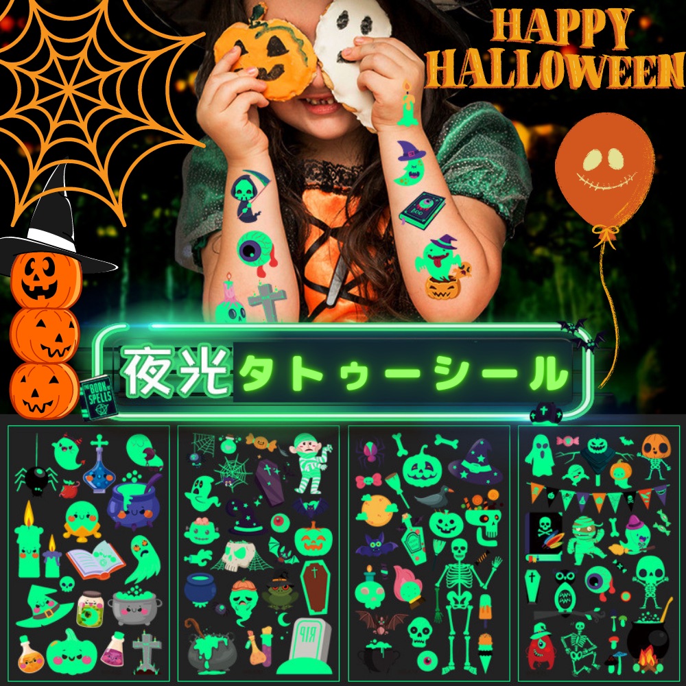 WS 夜光 ハロウィン タトゥーシール 夜光ステッカー 可愛い カボチャ 魔女 お化け メイク コスプレ パーティー イベント キッズ仮装 コスプレ