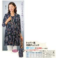 チュニック レディース 秋冬 トッパー風花柄チュニック 婦人服 ミセス シニア チュニック 花柄 8分袖 トッパーコート風 ネイビー fri p18031