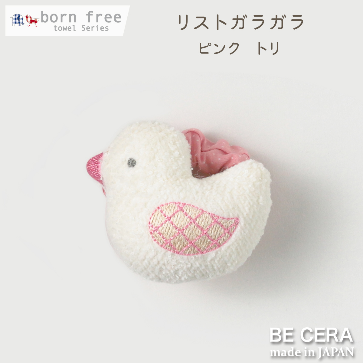 ・素材…綿100%・カラー…ピンク・サイズ…たて5.5×よこ6.5×奥行き6.5cm・原産国…日本製・やわらか素材で赤ちゃんの腕にはめて、振ると鈴の音がします。 リングの部分はゴムが入っているのでしめつけもなく安心です。リストガラガラ ゾウ