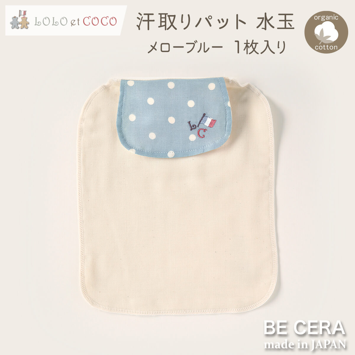 背中 汗取りパット 1枚入り 水玉 ブルー LOLO et COCO 4重ガーゼ オーガニック 超長綿 吸水加工 ベビー用品 出産祝い おしゃれ かわいい 日本製 女の子 男の子
