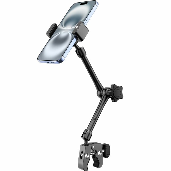Dosvsi スマホホルダー エアロバイク/車椅子/マイクスタンド/ベビーカー/ゴルフカートなどに適用 カップ用 ハンドルバー ポール マウント 360度角度調整可能 頑丈で耐久性 脱着簡単 ロングアーム 22cm 日本語説明書付き iPhone16 15 14 13 12 Pro Max SE Galaxy Z Flip など4-7インチ全機種対応