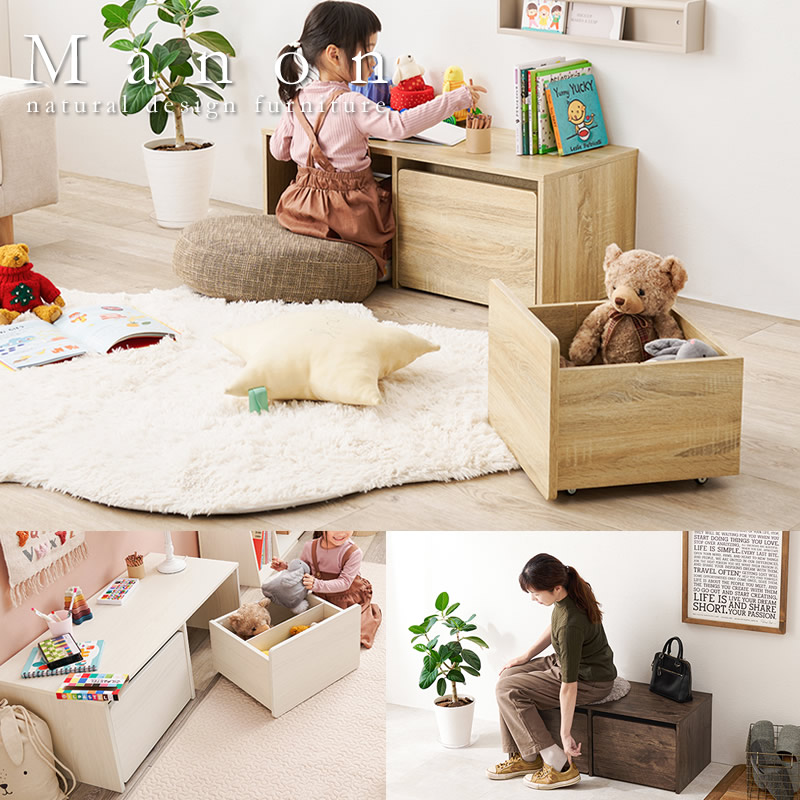 ローデスクとして使ったり、腰掛けたり、収納したり、様々なシーンで活躍するワゴン付きベンチです。