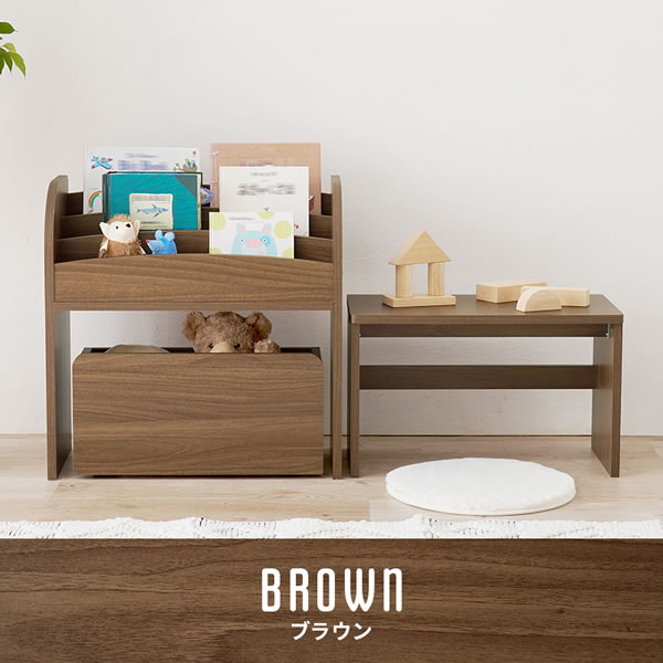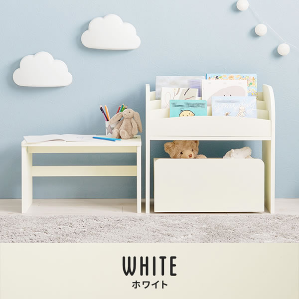 表紙が見やすくオープンタイプなので出し入れしやすい絵本・マガジンラック。コンパクトにまとまるミニデスクと収納に便利なワゴンが付いた3点セット。