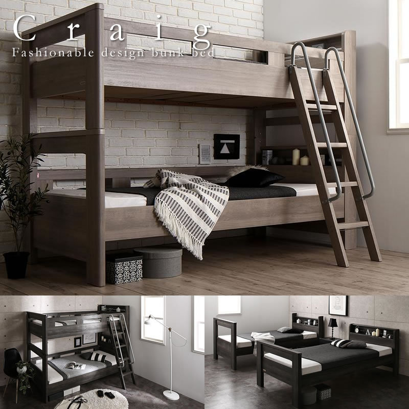二段ベッド 分割 シングル2台対応 耐荷重400kg 頑丈設計 コンセント付き 棚付き すのこ 高さ調整