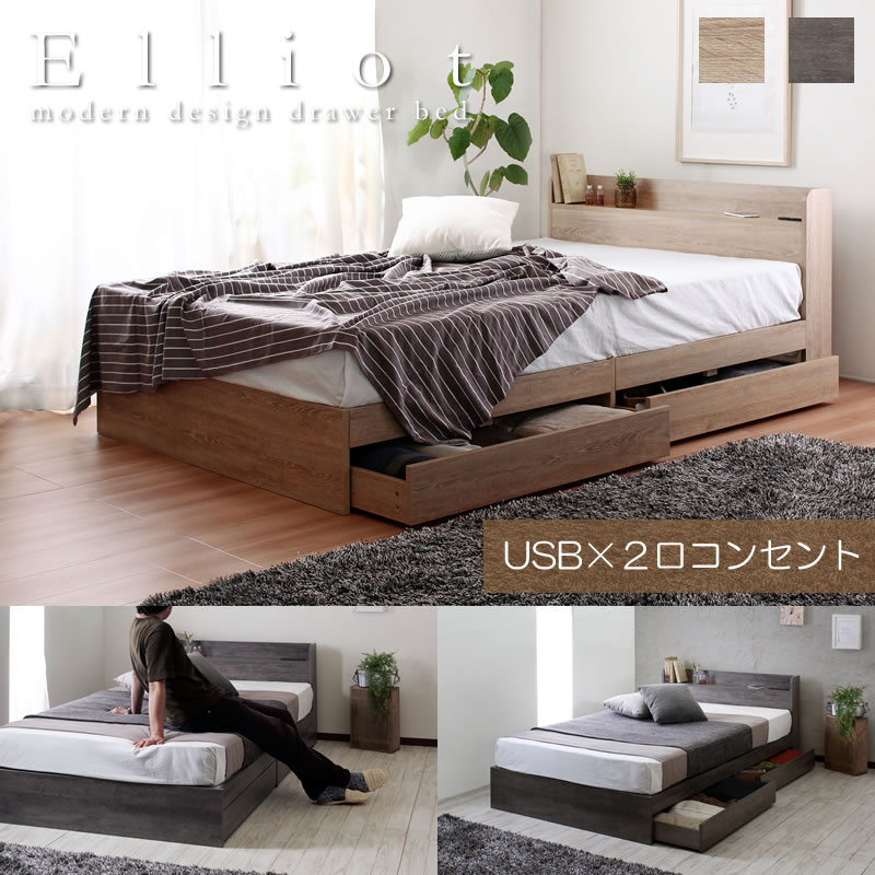 収納ベッド 引き出し付き USB コンセント 棚付き シャビー おしゃれ シングル セミダブル ダブル Elliot