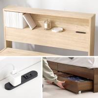 本棚として使える二段棚付きの収納ベッド。ヘッドボードはB6サイズの本を多数収納できる設計で、スマホや小物もまとめて置ける便利な仕様です。コンセント付きで充電にも対応し、就寝前の使い勝手も向上。引き出し収納はキャスター付きで左右どちらにも設置可能、反対側はオープン収納として活用できます。耐荷重350kgの頑丈設計で敷布団にも対応し、安心して使用可能。通気性にも優れた構造で快適な寝環境を実現する高機能ベッドです。