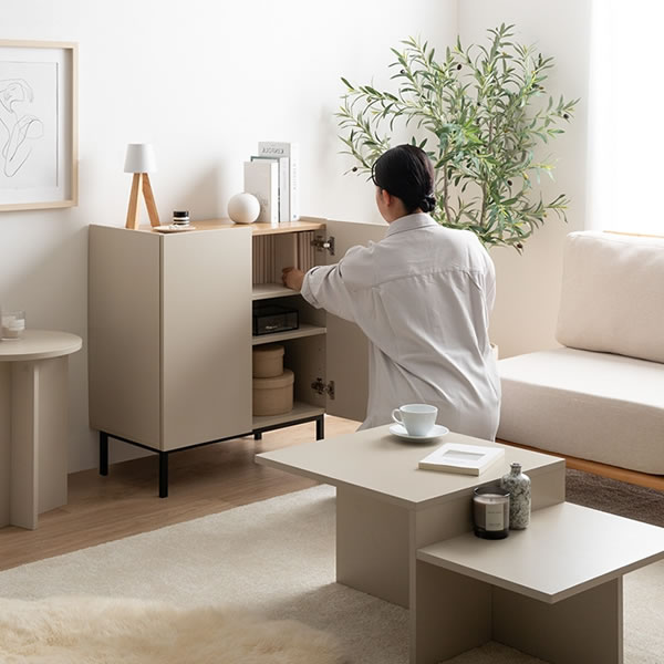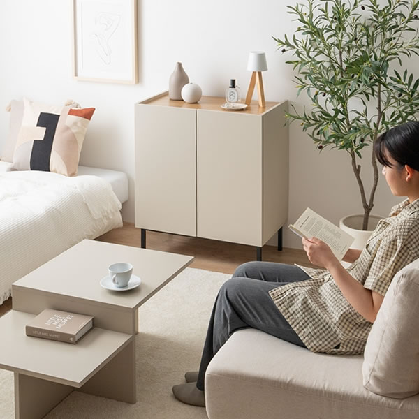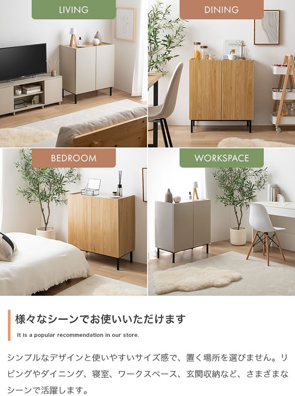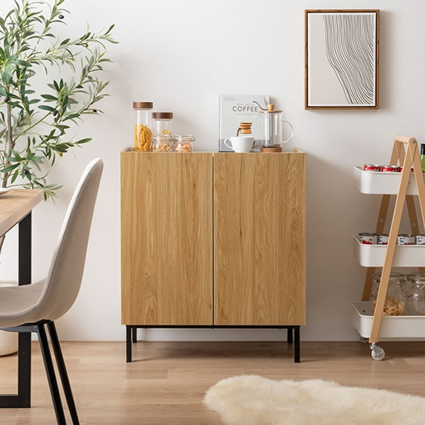 直線的なフラットデザインとバイカラーの配色が魅力のキャビネット。木目×グレージュの組合せが空間に洗練された印象を与え、リビングや玄関、ワークスペースにもなじみます。幅70cmのスリム設計ながら、小物からA4書類、ルーターまで収納可能な大容量。背面にはコード穴があり、電子機器の収納にも便利。6段階の可動棚で使い勝手も抜群。お手入れ簡単なメラミン加工。抜け感のあるブラックスチール脚付きで、床掃除もスムーズです。