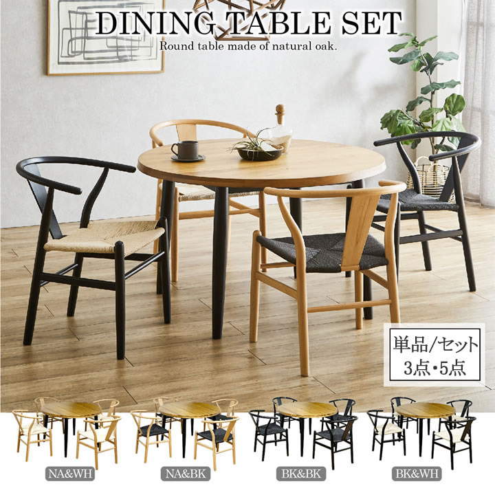 円形ダイニングテーブル 110cm+北欧風チェアセット 単品 3点 5点セット 天然木オーク無垢 モダン 木製 ペーパーコード おしゃれ 4色展開