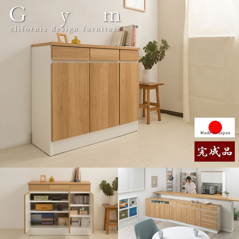 ナチュラルでカリフォルニアインテリアをイメージした薄型キッチンリビングボード【gym】ジムシリーズ。ライトな感覚でインテリアになじみやすいナチュラル木目&カラーを主としてLDに映えます。4段チェストやガラスと一体化したコーナーキャビネット、引出し付きキャビネットなどシンプルながら機能性もしっかりと装備し、リビングボードとして、TVボードとして、またキッチンカウンターとして様々な使い方が可能。お部屋を明るく、ずっと眺めていたくなる優しい木目は、カリフォルニアサーフの海辺のハウスをイメージした爽やかな印象。