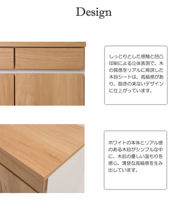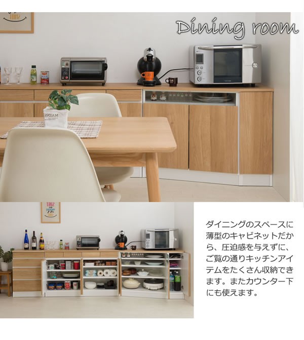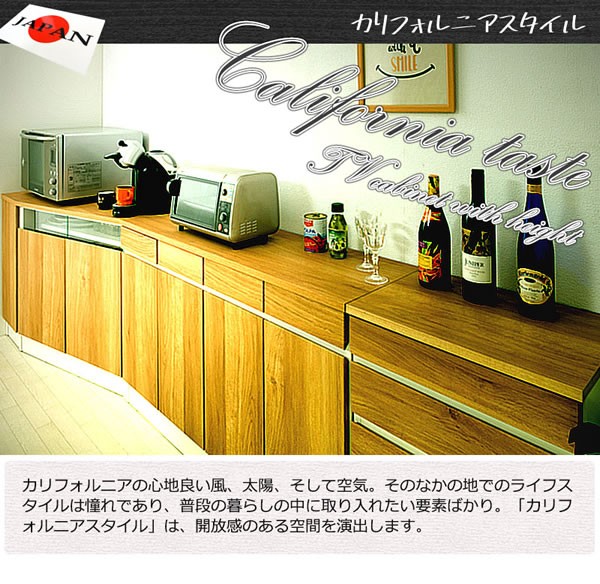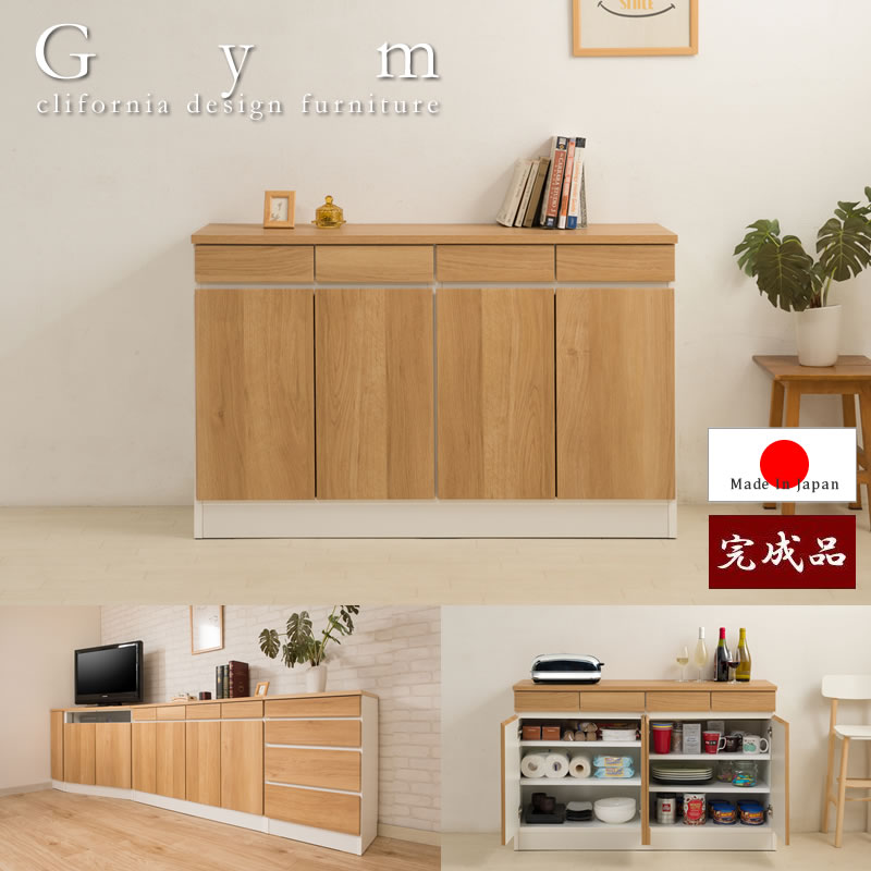 ナチュラルでカリフォルニアインテリアをイメージした薄型キッチンリビングボード【gym】ジムシリーズ。ライトな感覚でインテリアになじみやすいナチュラル木目&カラーを主としてLDに映えます。4段チェストやガラスと一体化したコーナーキャビネット、引出し付きキャビネットなどシンプルながら機能性もしっかりと装備し、リビングボードとして、TVボードとして、またキッチンカウンターとして様々な使い方が可能。お部屋を明るく、ずっと眺めていたくなる優しい木目は、カリフォルニアサーフの海辺のハウスをイメージした爽やかな印象。
