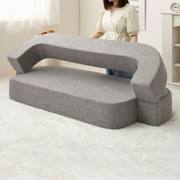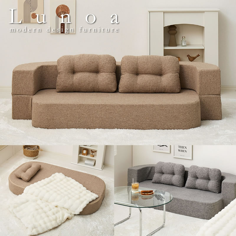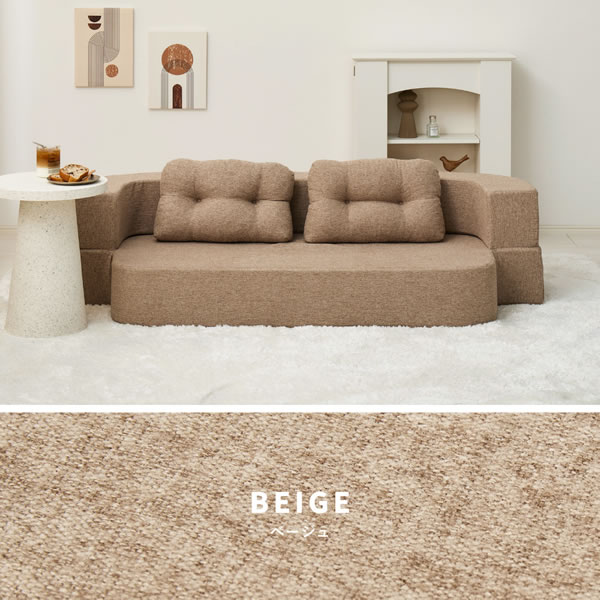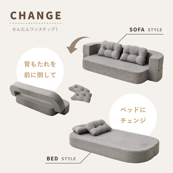 背もたれを前に倒すだけで、2人掛けソファからベッドへ簡単に切り替えできるソファベッド。座面高さ約20cmのロースタイルで圧迫感が少なく、お部屋を広く見せます。内部にはウレタンをたっぷり使用し、柔らかさとしっかりした支えを両立。長時間座っても疲れにくい座り心地です。丸みのあるデザインと柔らか素材でお子様がいる家庭でも安心して使えます。組立不要の圧縮梱包仕様で、狭い玄関や通路でも搬入しやすく、輸送コスト削減により低価格を実現しました。クッション2個付きで枕としても使えます。