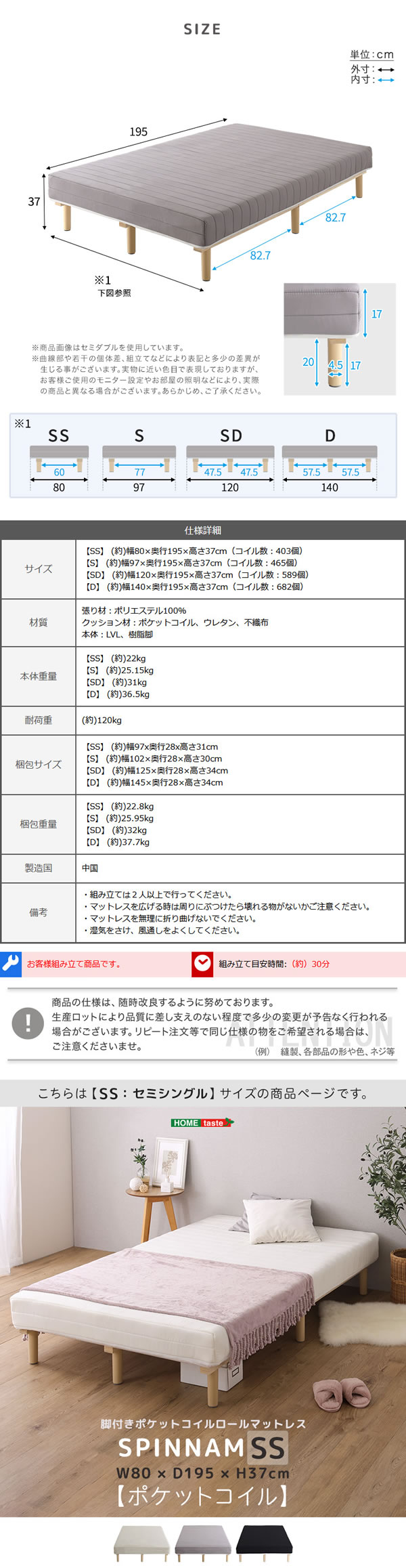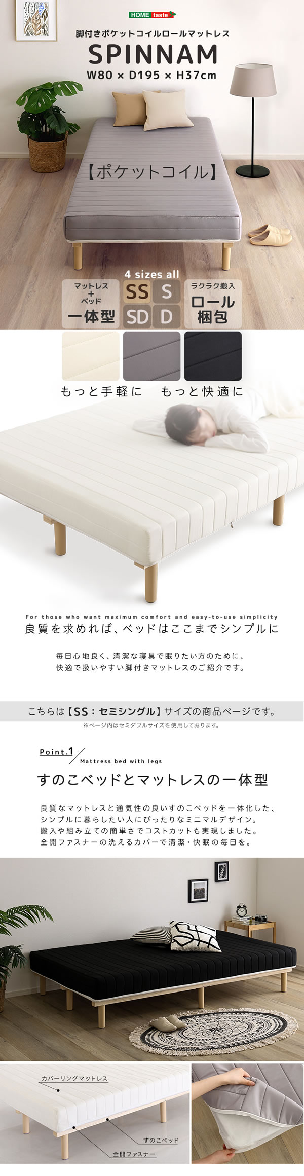 脚付きマットレス セミシングル ポケットコイル 体圧分散 一人暮らし すのこベッド 一体型 洗えるカバー 圧縮ロール 硬め 頑丈 安定感 快眠 省スペース 収納付き 新生活 寝具 コンパクト シンプル