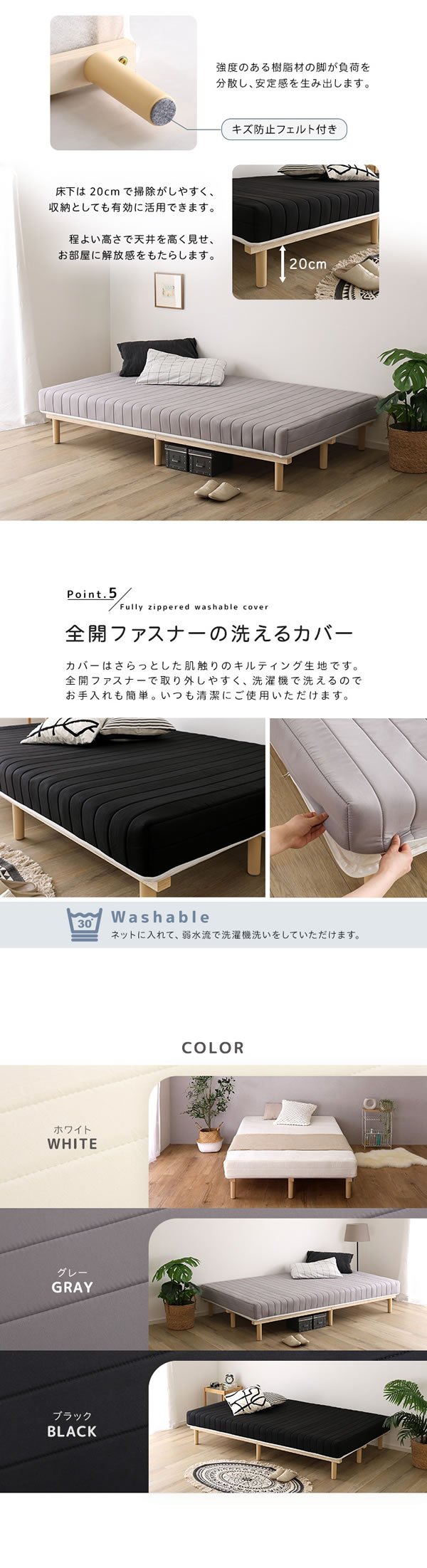 ベッドとマットレスが一体型になった省スペース設計の脚付きマットレス。体圧分散性に優れたポケットコイル(並行配列)が体を点で支え、寝返りもスムーズ。厚さ17cmで底つき感なく快適です。通気性の良いすのこ構造、耐荷重120kgの頑丈設計、6本脚で安定感も抜群。床下20cmの高さで掃除や収納にも便利。カバーは全開ファスナーで外して丸洗い可能。圧縮ロール梱包で搬入も簡単。ホワイト・グレー・ブラックの3色から選べる、コンパクトでも上質な寝心地のマットレスです。