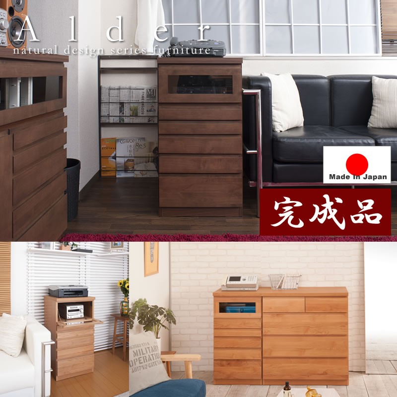 アルダー材特有の、美しい木目をそのまま活かしているので、温かみがあり、かつ高級感も醸し出します。天然木の温かみを是非、感じてください。FAX台としてはもちろん、窓下収納など様々なシーンで活躍します。深さの違う多段引出しで細々したものなど仕分け収納に抜群!リモコンの赤外線も受信可能なガラス付きフラップ扉にはAV機器なども収納できます。浅引出し以外はスライドレール付きで出し入れ楽々。幅90cmタイプは扉収納も付いて前面のアルダーの雰囲気抜群!同シリーズのTVボードと組み合わせて更に雰囲気UP!
