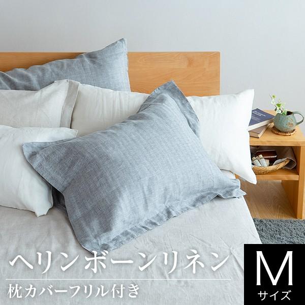 枕カバー フリル付 43×63 麻100% フレンチリネン ヘリンボーンリネン M ヘリンボーン織 洗える オールシーズン ピローカバー