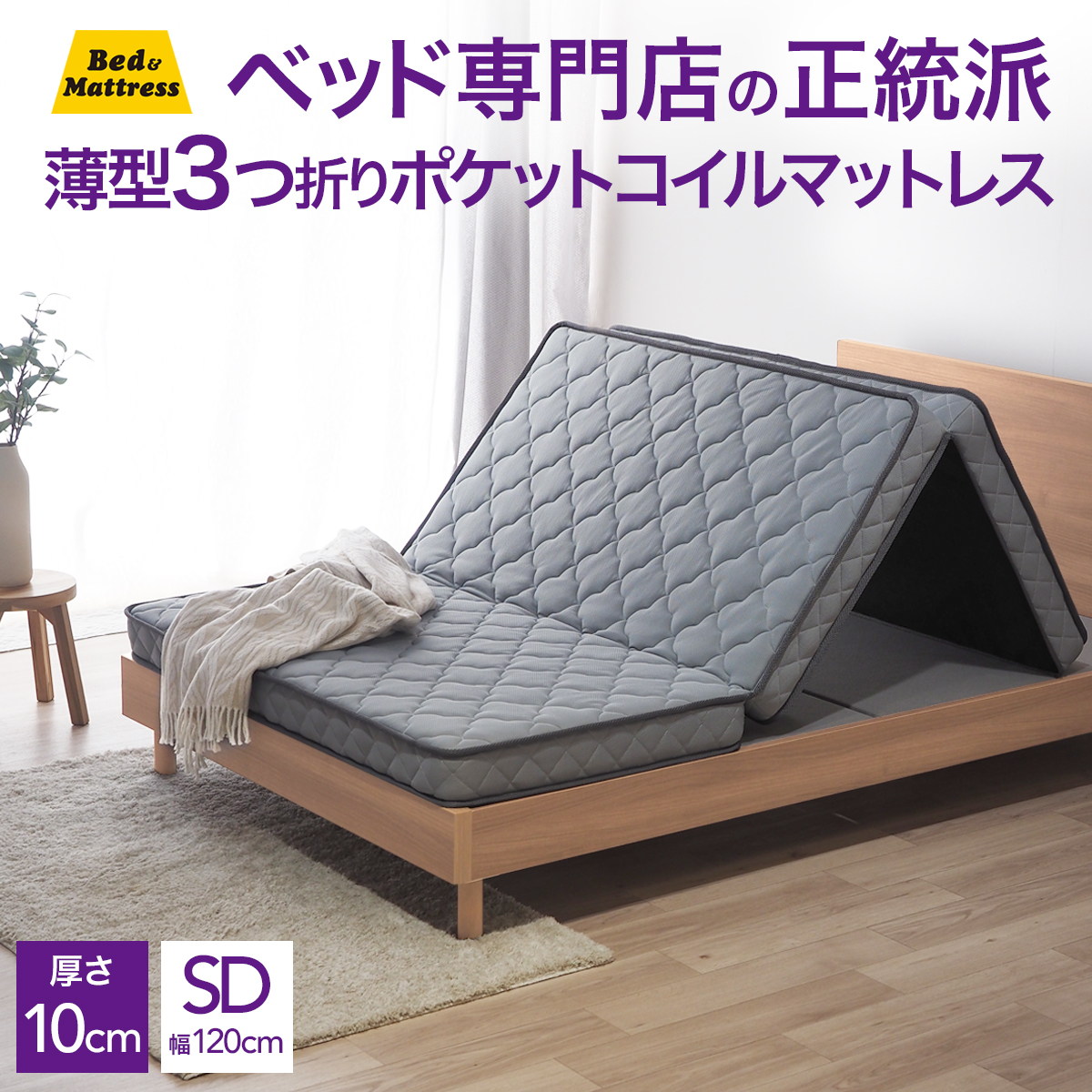 マットレス 3つ折り セミダブル 薄型 折りたたみ ポケットコイル ベッドマットSM103P3U 体圧分散 厚み10cm