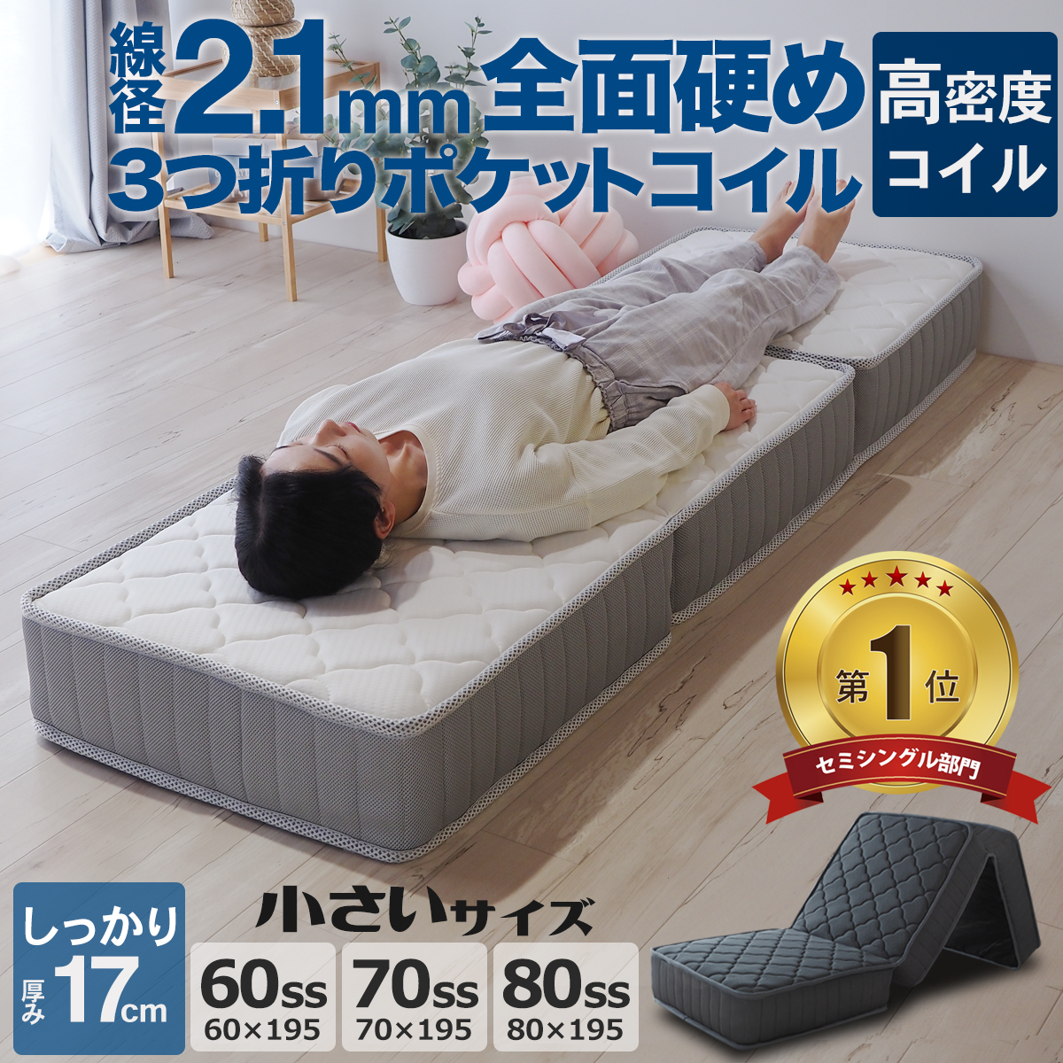 マットレス 3つ折り セミシングル 折りたたみ ポケットコイル 60スモールシングル 70スモールシングル 80スモールシングル ベッドマット ZH133P3N