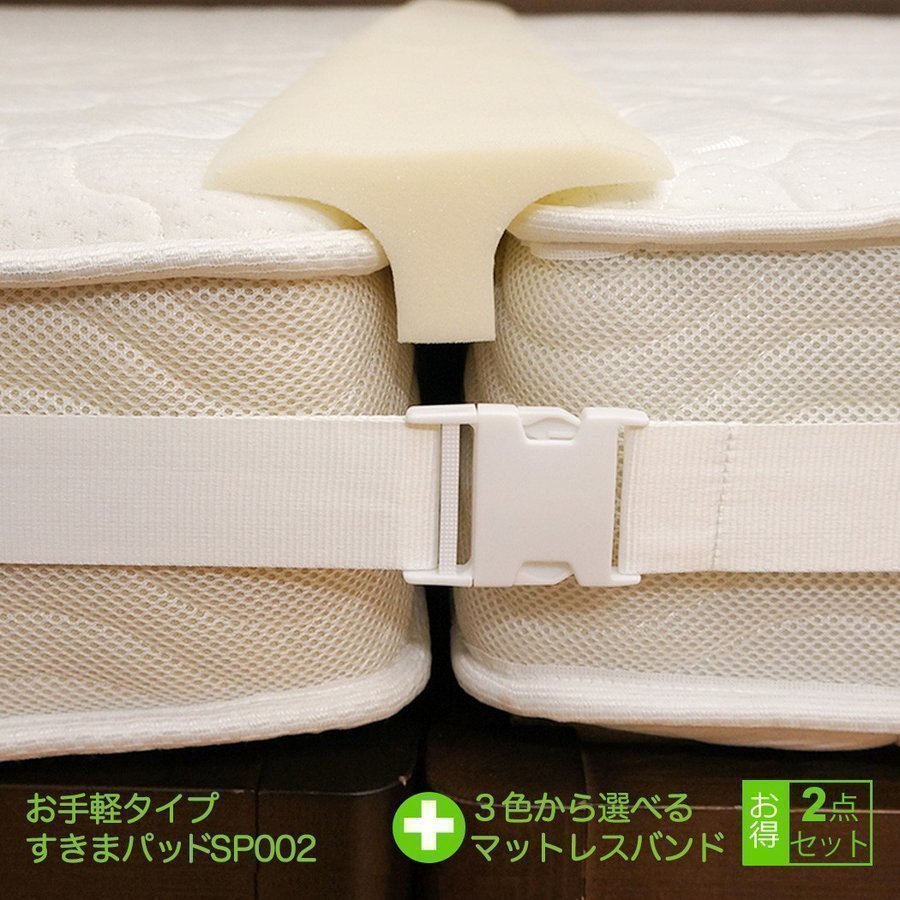 \マットレス間のすきまを埋める/ お手頃価格のすきまパッド、安いけれどすきまパッドの機能を果たします。 | \マットレス同士を離さない/ マットレスとマットレスをしっかり固定、ダブル+ダブルまでのマットレスを固定することができます。 | |