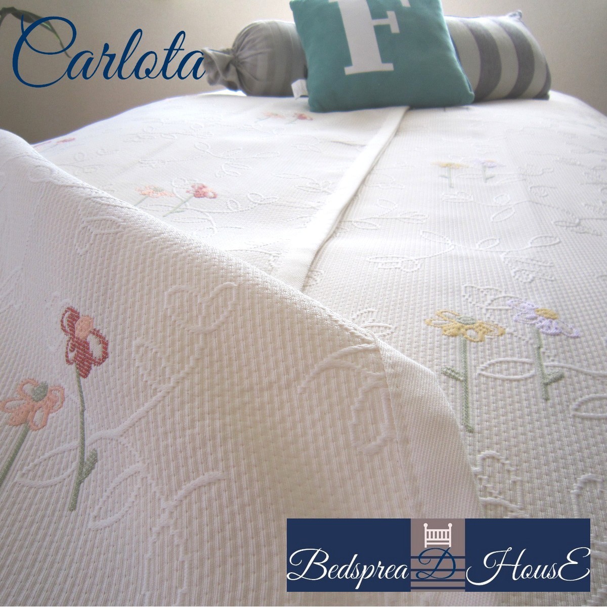 ベッドスプレッド カーロタは花と葉の白無地の地模様のかすかなストライプの生地の上に色糸の五葉と四葉と三葉の花が、刺繍をほどこしたように浮き上がります。