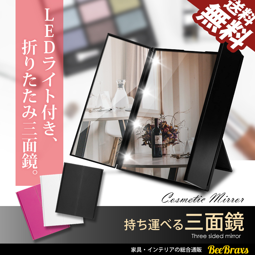 卓上ミラー 三面鏡 LEDライト付 女優ミラー スタンドミラー 卓上鏡 化粧 メイク 送料無料