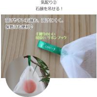 速乾性と嬉しい気遣い : 水切れが非常に早く、すぐに乾きます。石鹸をそのまま吊して保管できるフックがついています。フックは割れると使えなくなるプラスティックではなく、リボンを使用するなど、細かな気遣いが嬉しい商品です。