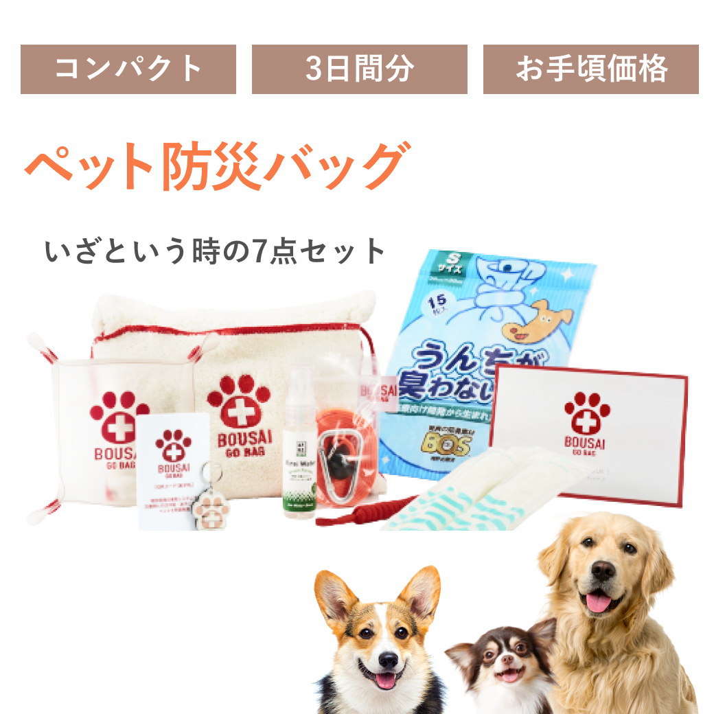 地震、洪水、台風、竜巻など、いつ起こるか分からない災害に備えて、あなたのペットに必要なアイテムを7点セットにしました。