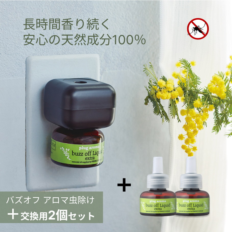 小さい子どもや赤ちゃんでも安全に使えて、長時間効果が続く、大人気、パーフェクトポーション、バズオフシリーズの室内用のアロマの虫よけリキッドを充填しています。