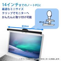 ■ノートPCのモニターにクリップで固定できるUSB給電のLEDライトです。横幅が約26cmなので、約14型までのノートPCに最適です。キーボードライト非搭載端末の手元灯として、またPCと書類を見比べる際のお供としても活躍します。