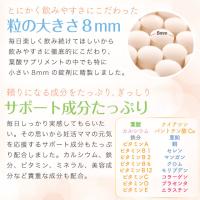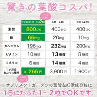 栄養成分表示(1日2粒あたり):エネルギー 0.62kcal たんぱく質 0.01g 脂質 0.01g 炭水化物 0.47g 食塩相当量 0.03g 葉酸 800μg カルシウム 66.66mg 鉄 6.66mg マンガン 0.06mg 亜鉛 0.04mg 銅 0.007mg クロム 0.5μg モリブデン 0.5μg セレン 0.2μg
