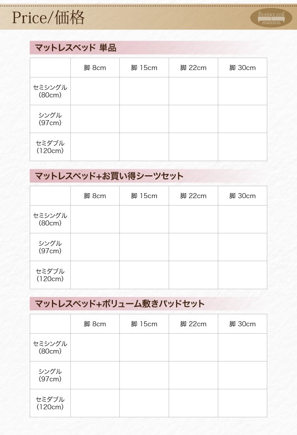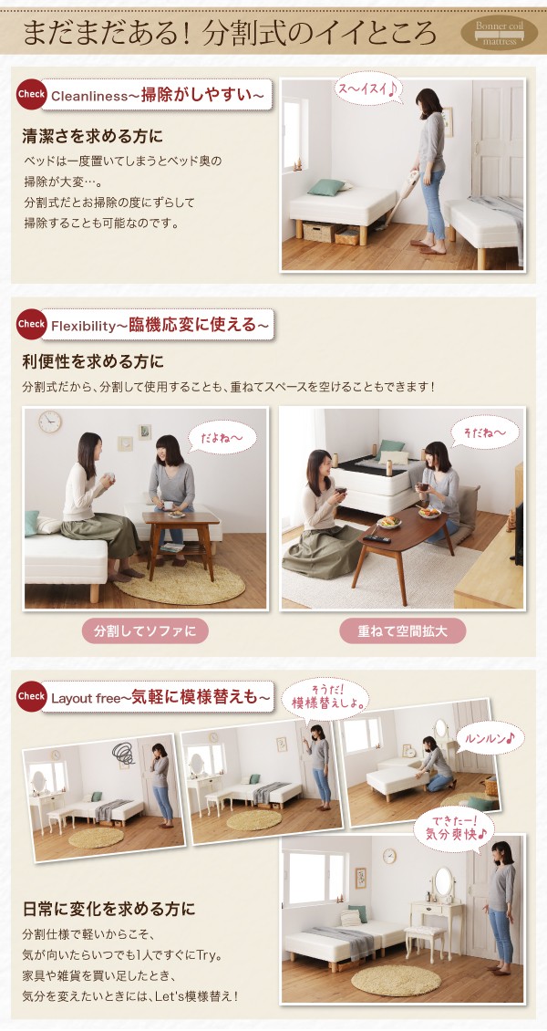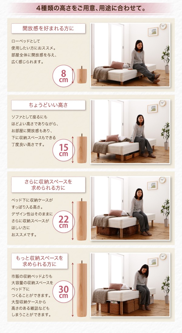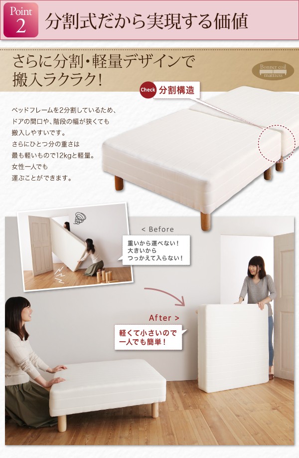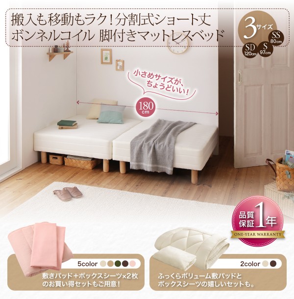 ショート丈分割式 脚付きマットレスベッド ボンネルマットレスベッド ベッドパッド・シーツは別売りセミシングル ショート丈 脚15cm