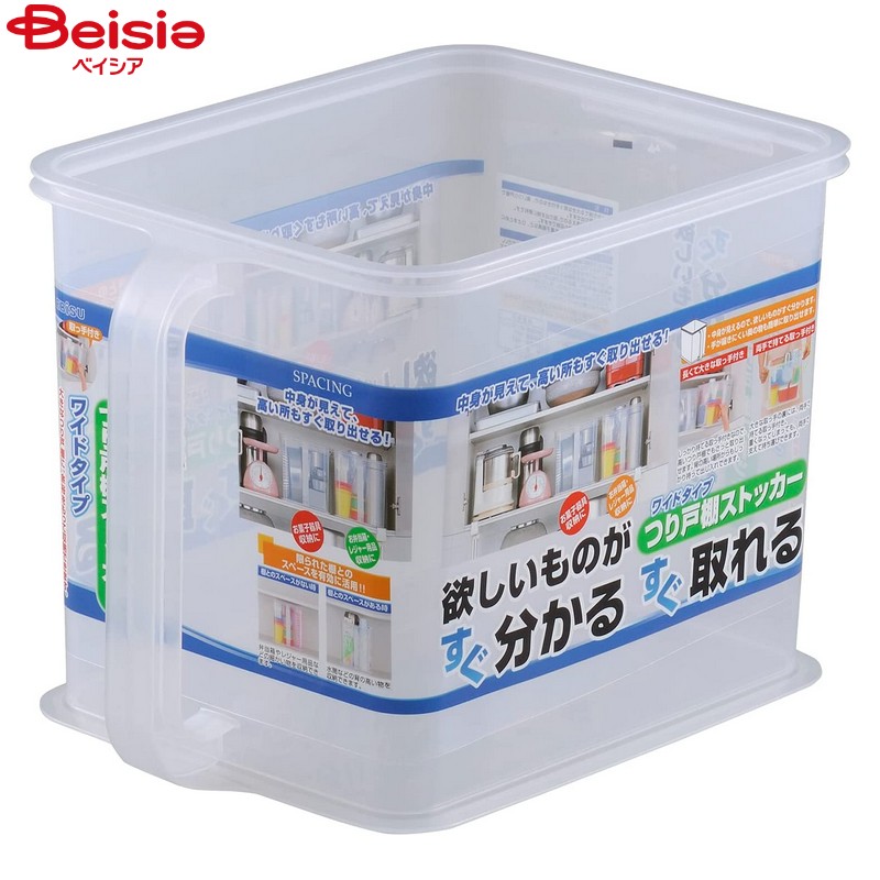 | 商品特徴 | 透明だから収納したものが一目瞭然!取り出す時に大変便利です。大きな取っ手付きなので、しっかり持てて高いつり戸棚からでもさっと取り出せます。背の高い水筒なども収納できます。お弁当箱やレジャー用品・買い置き品など、ひとまとめに収納できます。ワイドタイプだから大きなつり戸棚に、余裕をもって収納できます。 |