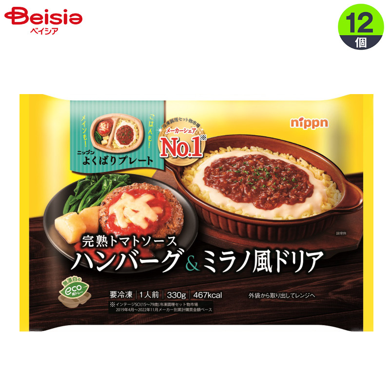完熟トマト使用のトマトソースハンバーグと人気のミラノ風ドリアが一度に楽しめるセット。