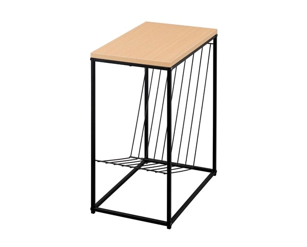 木とスチールをミックスしたサイドテーブルです。天板下のメッシュ棚は雑誌などをディスプレイできます。天板はメラミン樹脂加工で熱や水、汚れに強くお手入れが簡単です。場所を選ばずお使いいただけます。ベッドサイドやソファ横などに置けるコンパクトなサイズです。お客様組み立てとなります。