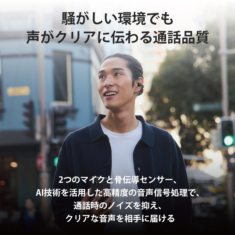 2つのマイクにより、自分の音声をクリアに届けます。また、骨伝導センサーは周囲の音を拾わず自分の声の振動のみを拾うため、通話時の周囲のノイズを抑えます。