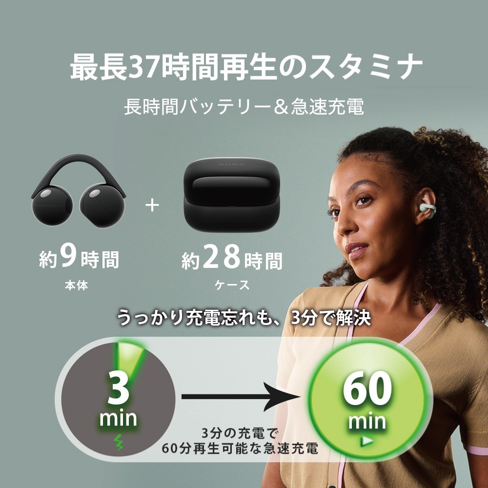 本体最長約9時間バッテリーと、ケース充電込で合計最長約37時間バッテリーが持続します。また、3分充電で約60分再生可能のクイック充電にも対応。