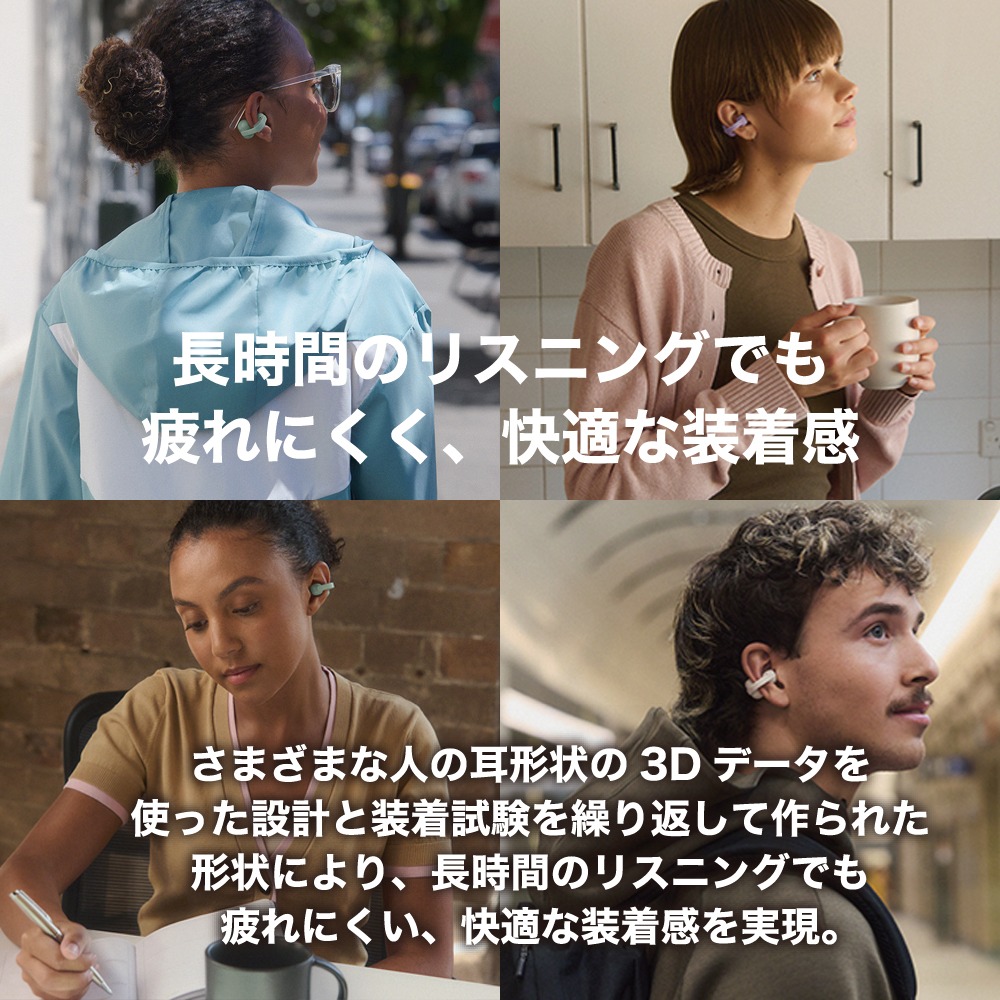 さまざまな人の耳形状の3Dデータを使った設計と装着試験を繰り返して作られた形状により、長時間のリスニングでも疲れにくい、快適な装着感を実現。