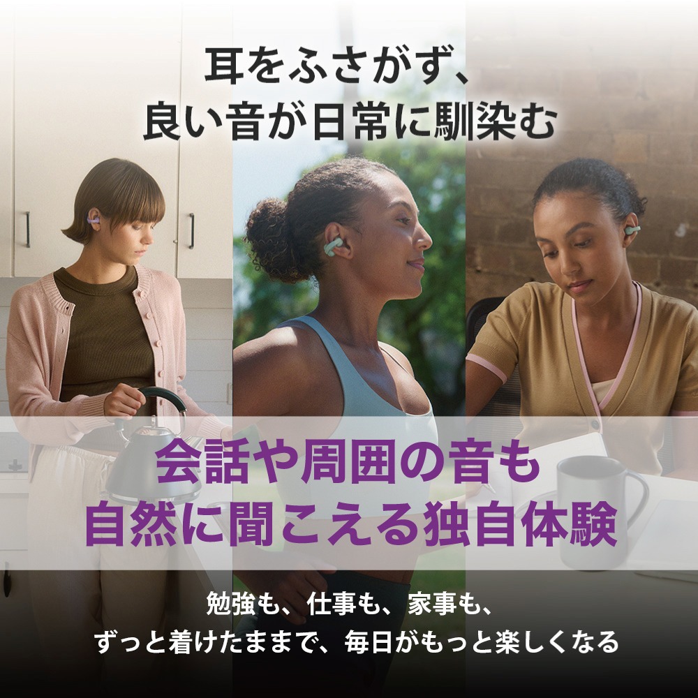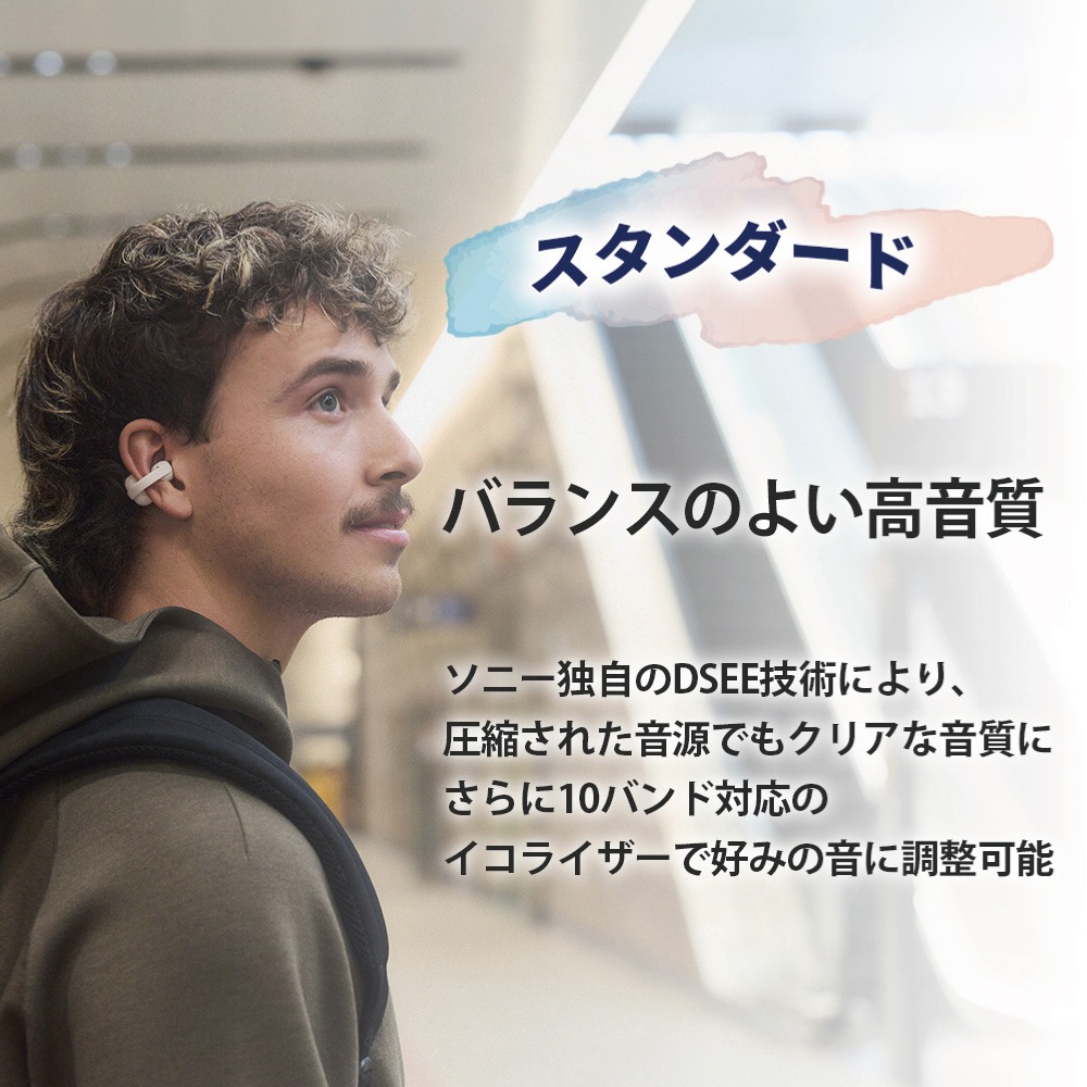 ソニー初のイヤカフ形状に最適化されたアンテナ設計と、同時再送システムを採用。従来比で接続性が向上し、雑踏の中でも安定した接続で音楽をお楽しみいただけます。