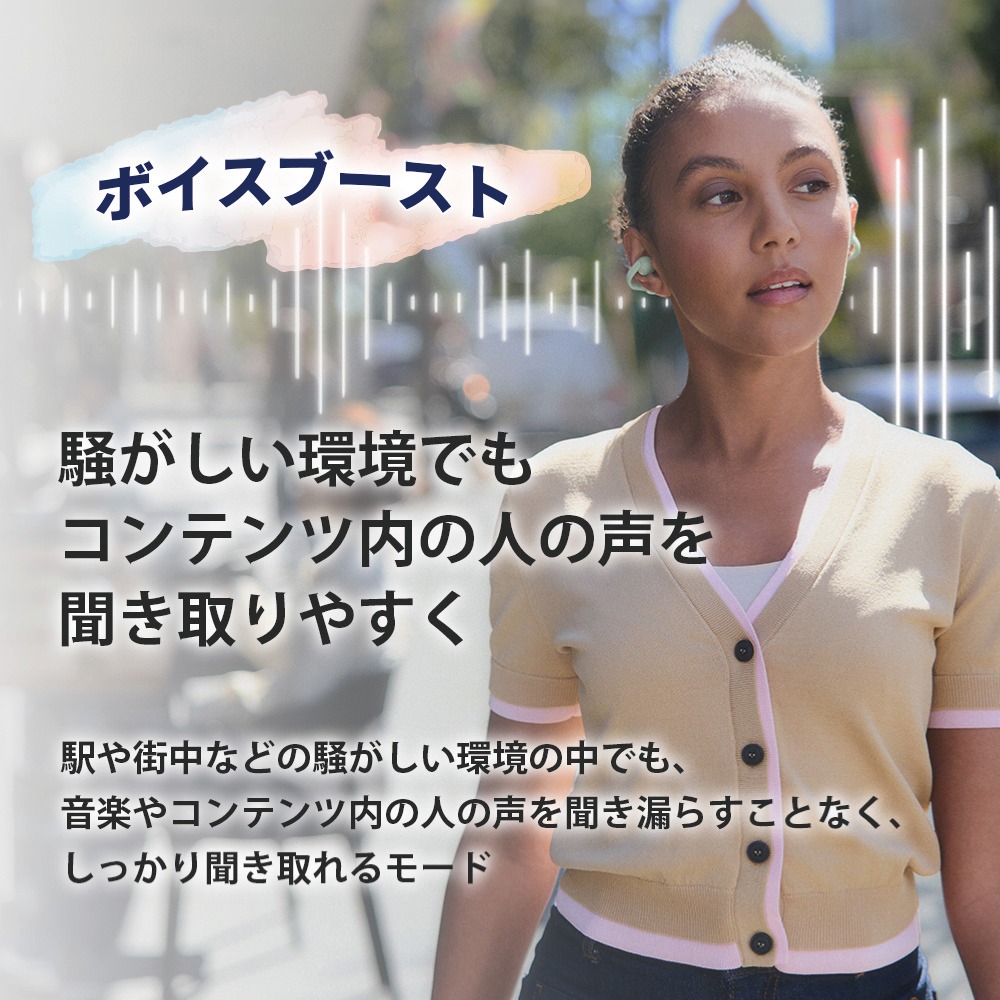 本体タップ操作またはSony Sound Connectアプリで、「スタンダード」「ボイスブースト」「音漏れ低減」の3つのモードに切り替えることが可能。ご利用のシーンに応じて最適なモードを選択し、さまざまな環境で快適なコンテンツ体験をお楽しみいただけます。