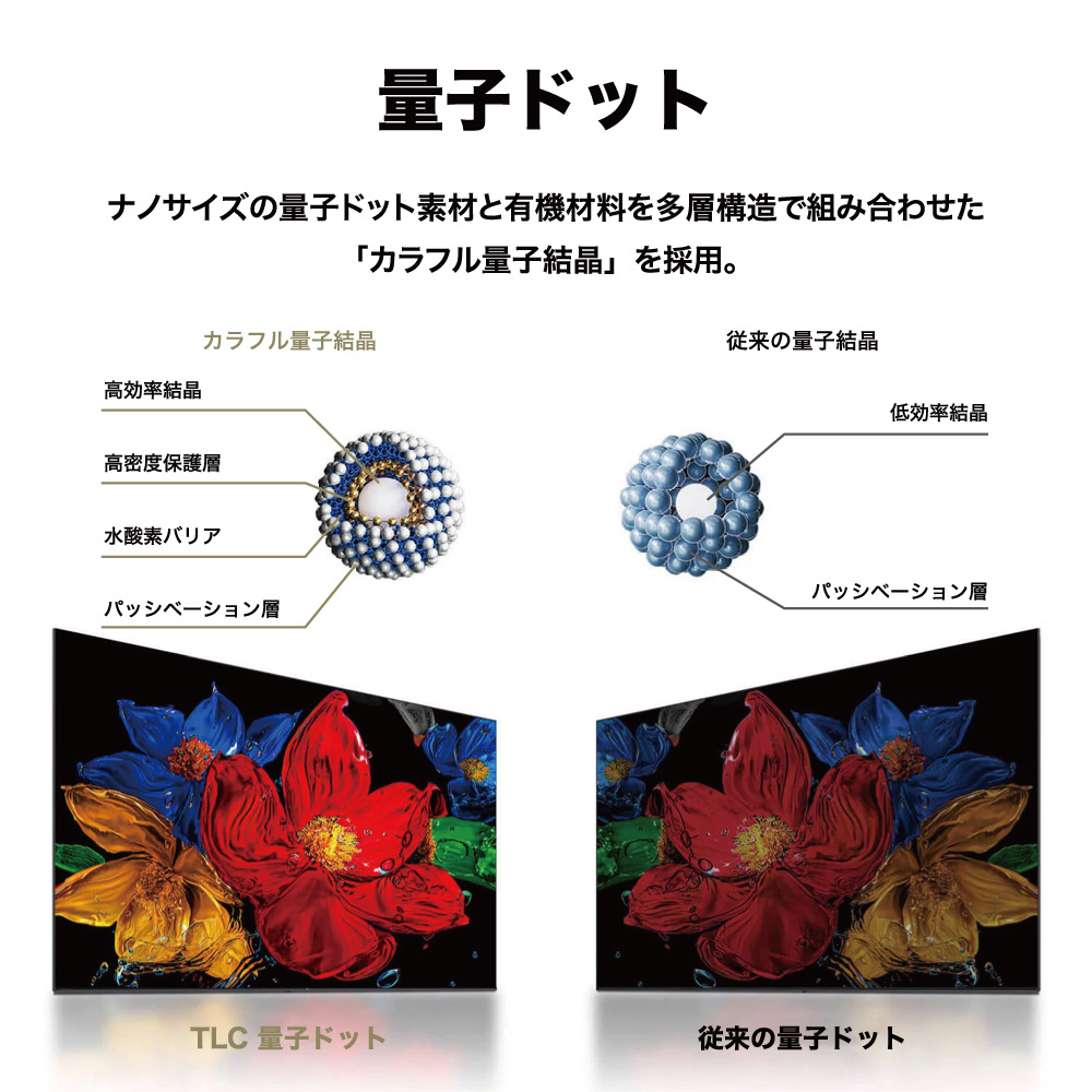 | TCLの量子ドットは、ナノサイズの量子ドット素材と有機材料を多層構造で組み合わせた「カラフル量子結晶」を採用。バックライト技術との融合により、優れた色表現と光学性能を実現します。 明るさの強化により細部まで明瞭に描き出し、リアルで没入感のある視聴体験を提供します。 |