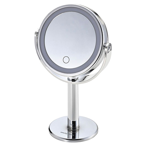 LED照明付きのスタンドミラーです。LEDが埋め込まれており、明るく照らしてメイクができます。タッチセンサーで点灯。裏面は拡大鏡になっています。