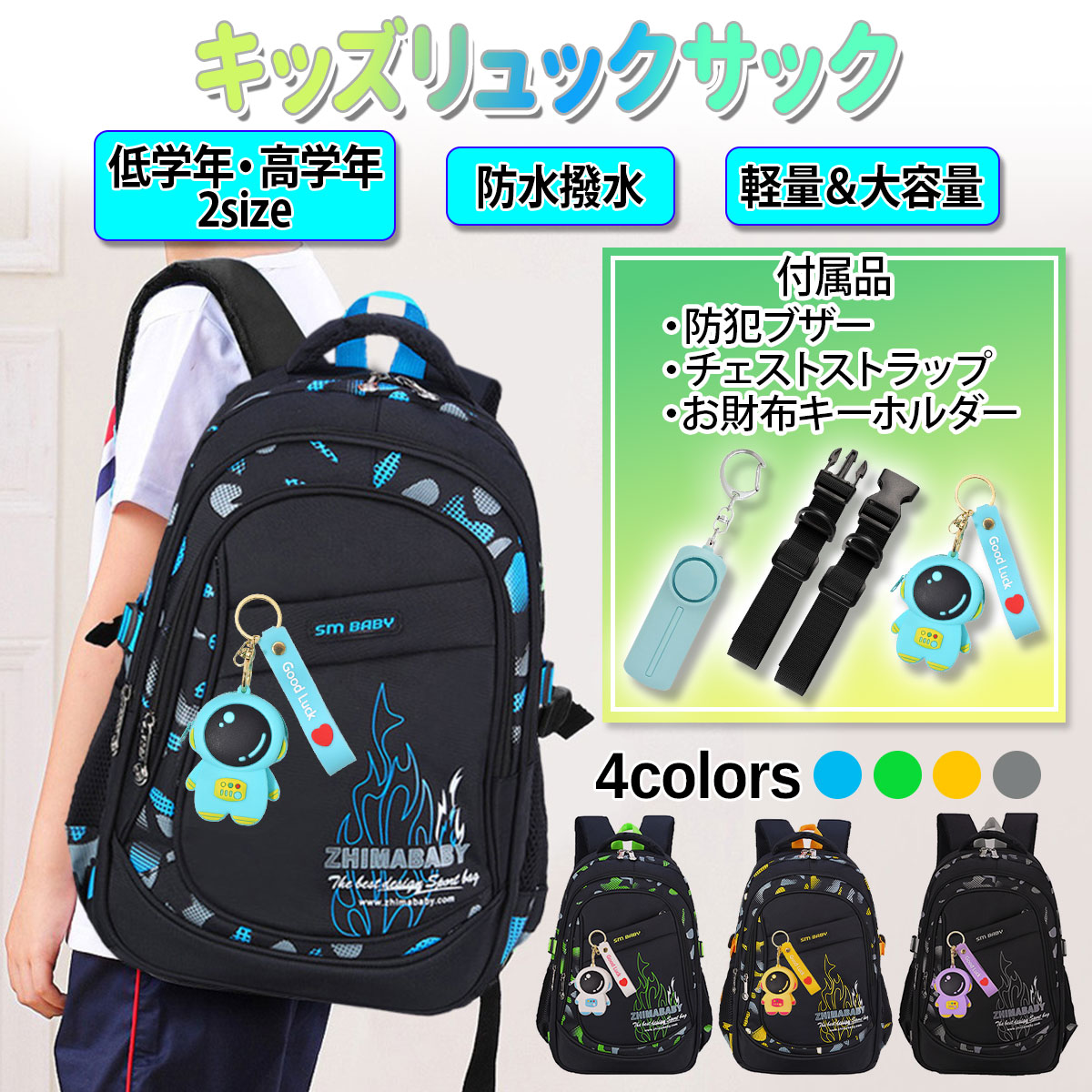 小学生のお子様におすすめのキッズリュックサックです。通学、通塾、習い事、ハイキング、修学旅行など幅広くご利用いただけます。プレゼントにも最適。お子様の安全のための防犯ブザーと、ショルダーずり落ち防止に役立つチェストストラップと、小物入れやお財布にもなる宇宙飛行士キーホルダー付き(お届け時リュックの中に入っています)。