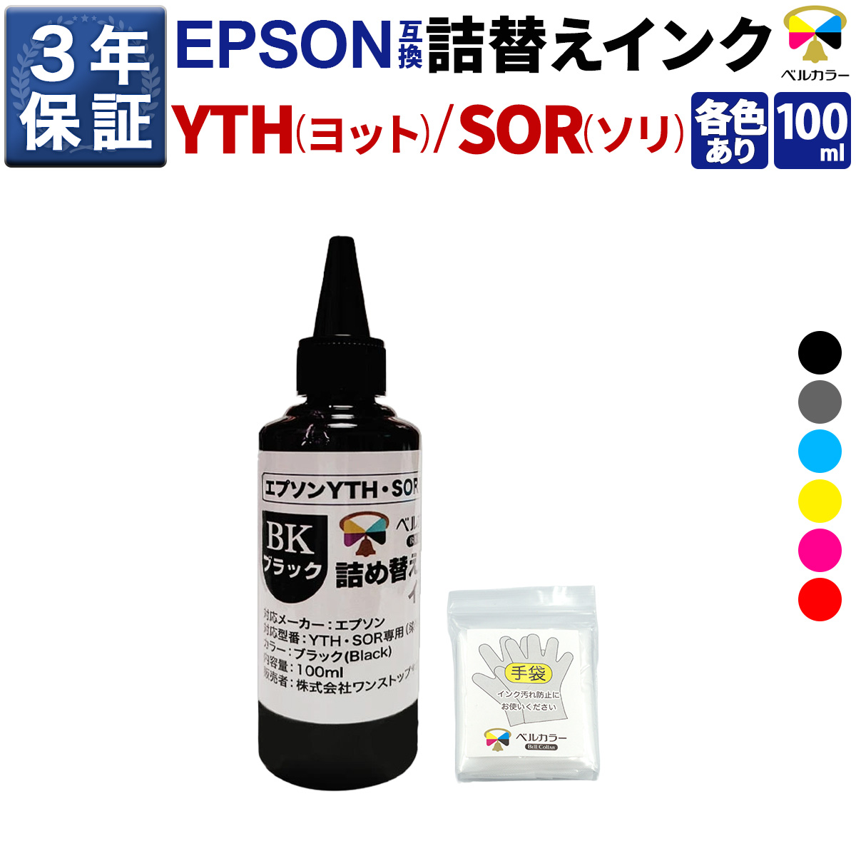 エプソン YTH / SOR 対応、補充用インクボトル(100ml)単品です。